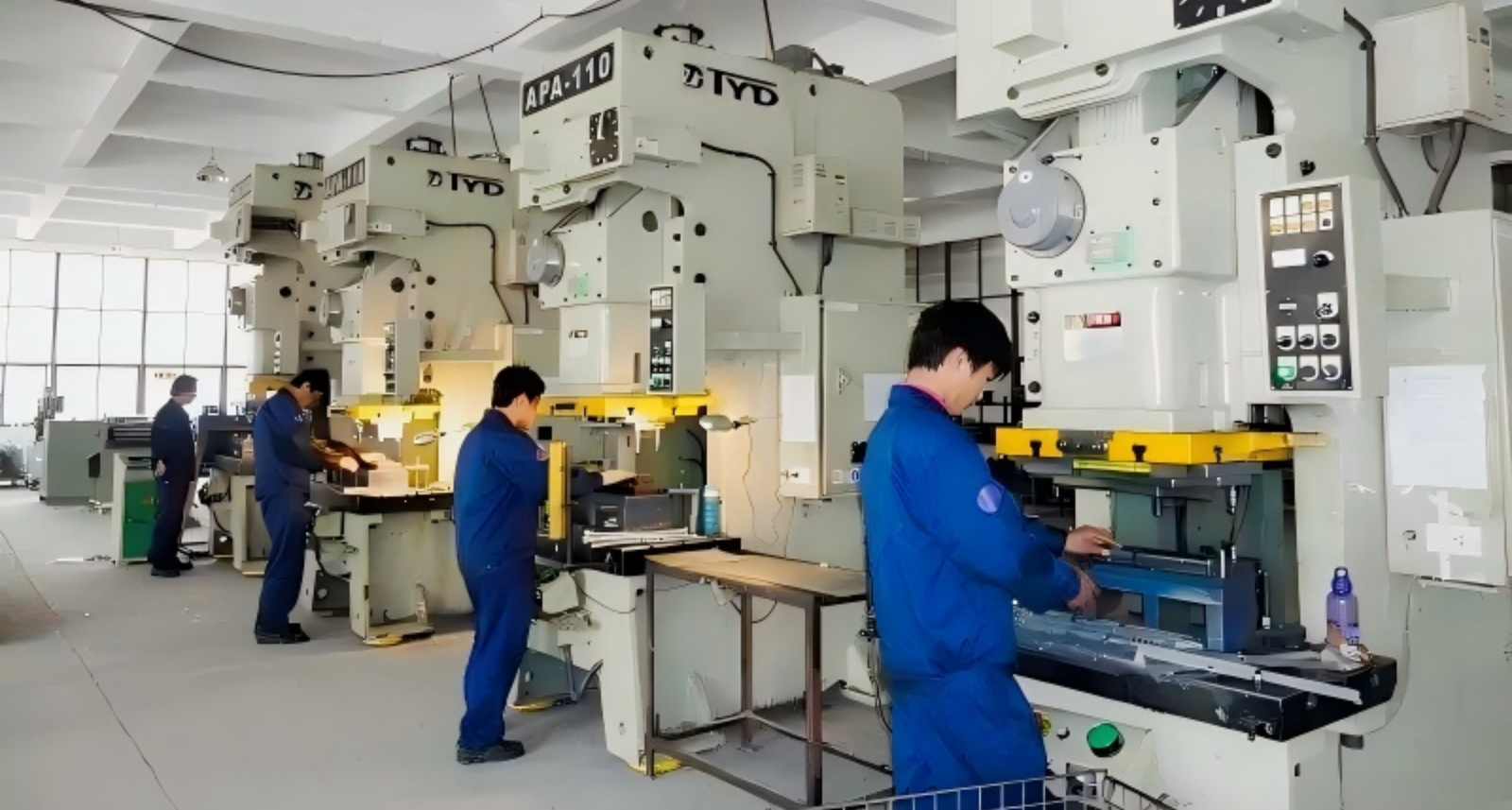 The equipment covers high-precision stamping machines, hydraulic stretching machines, CNC lathes, CNC machining centers, surface grinders, grinding machines, ultrasonic cleaning machines, magnetic polishing machines, electron microscope detectors, three-coordinate measuring instruments, drying ovens, etc., supporting the production from small precision parts to medium-sized structural parts.